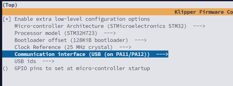 [Klipper 安装文档](https://www.klipper3d.org/zh/Installation.html) ### 构建和刷写微控制器 ```bash cd ~/klipper/ make menuconfig ``` * 配置信息如下图  * 刷写微控制器 ```bash # 查看连接到微控制器的串行端口 biqu@BJ:~/klipper$ ls /dev/serial/by-id/* /dev/serial/by-id/usb-Klipper_stm32h723xx_26003B000D51313339373836-if00 # 烧录执行文件 sudo service klipper stop make flash FLASH_DEVICE=/dev/serial/by-id/usb-Klipper_stm32h723xx_26003B000D51313339373836-if00 sudo service klipper start ```